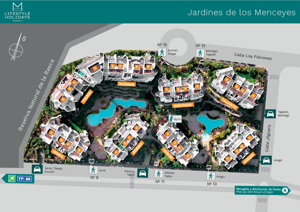 In "Jardines de los Menceyes", dem Eingang zu Palm-Mar, erwarten Sie subtropische Gärten, Wasserfälle und zwei Swimmingpools, von denen einer und das Kinderbecken beheizt sind, sowie eine große Sonnenterrasse mit Liegen und Sonnenschirmen. "Jardines de los Menceyes" verfügt über einen voll ausgestatteten Fitnessraum mit Technogym-Geräten. Zehn Gehminuten entfernt befinden sich das Einkaufs- und Gastronomiezentrum und der schwarze Naturfelsstrand "la Arenita".